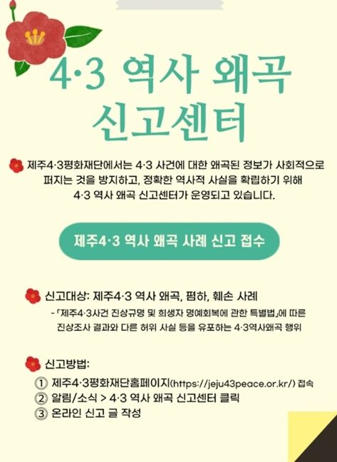 [한라일보] 지난해부터 운영한 제주도의 '4·3역사왜곡신고센터'(이하 센터)에 4·3 역사 왜곡 행위가 한 달에 1건꼴로 접수된 것으로 나타났다. 운영을 맡은 제주4·3평화재단은 앞으로 센터 운영을 적극 홍보하는 한편 4·3단체들과 왜곡 행위에 대해 공동 대응 방침을 이어갈 것이라고 했다.