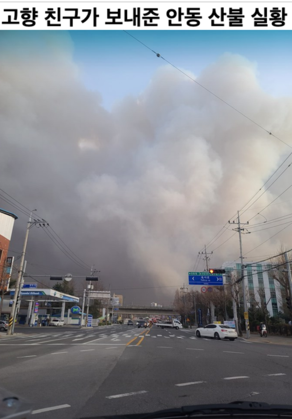 이날 오후 5시 안동시는 공식 재난 문자를 통해 “관내 산불이 우리 시 전역으로 확산되고 있으니 전 시민은 안전한 곳으로 대피하라”고 긴급히 알렸다.