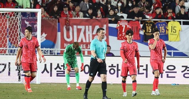 25일 수원월드컵경기장에서 열린 2026 북중미 월드컵 아시아 3차 예선 B조 8차전 대한민국과 요르단의 경기. 한국 선수들이 요르단 마흐무드 알마디에게 동점골을 허용한 뒤 아쉬워하고 있다. / 연합뉴스