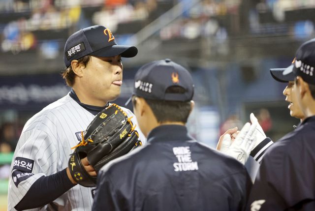 류현진은 1회 세 타자를 삼자범퇴로 막았다. 2회 선두 타자 문보경에게 안타를 내줬으나 후속 세 타자를 범타로 처리했다. 4회에는 선두 타자 송찬의에게 2루타를 맞았으나 1사 3루에서 상대의 3루 도루 시도 때 포수 최재훈의 정확한 송구로 아웃 처리하며 한숨을 돌렸다. 5회에는 1사 후 박동원을 우전 안타로 출루시켰으나 실점 없이 막았다.