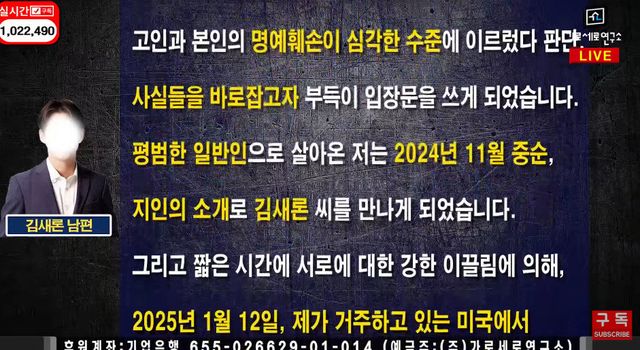 25일 오후 유튜브 채널 ‘가로세로연구소’에는 ‘김새론 남편 입장문 공개’라는 제목의 영상이 공개됐다.