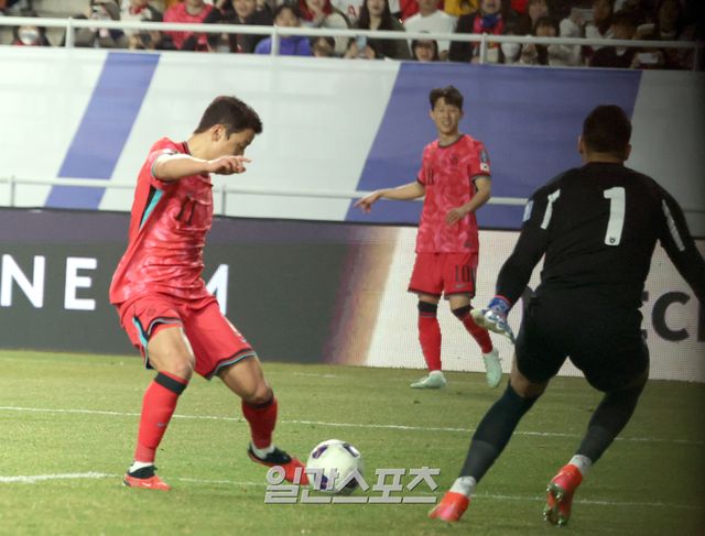한편 1분 뒤 한국은 달아날 기회를 놓쳤다. 손흥민이 박스 안에서 정확한 패스를 황희찬에게 건넸다. 황희찬은 골키퍼와 일대일 상황에서 칩슛을 시도했는데, 선방에 막혔다. 이어진 코너킥 공격에서 나온 황인범의 슈팅도 골대 위로 벗어났다.