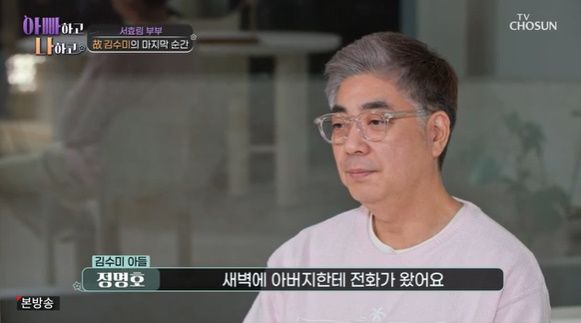 아들 정명호는 "어머니를 들어올리는 그 순간 몸이 너무 차갑고 호흡이 없었다. 구급 대원이 와서 '이미 심정지 된 지 몇 시간이 된 것 같다'라고 말했다"며 당시의 상황을 설명했다. 이어서 "장례식장에 있으면서도 믿기지 않았다"라고 전했다.