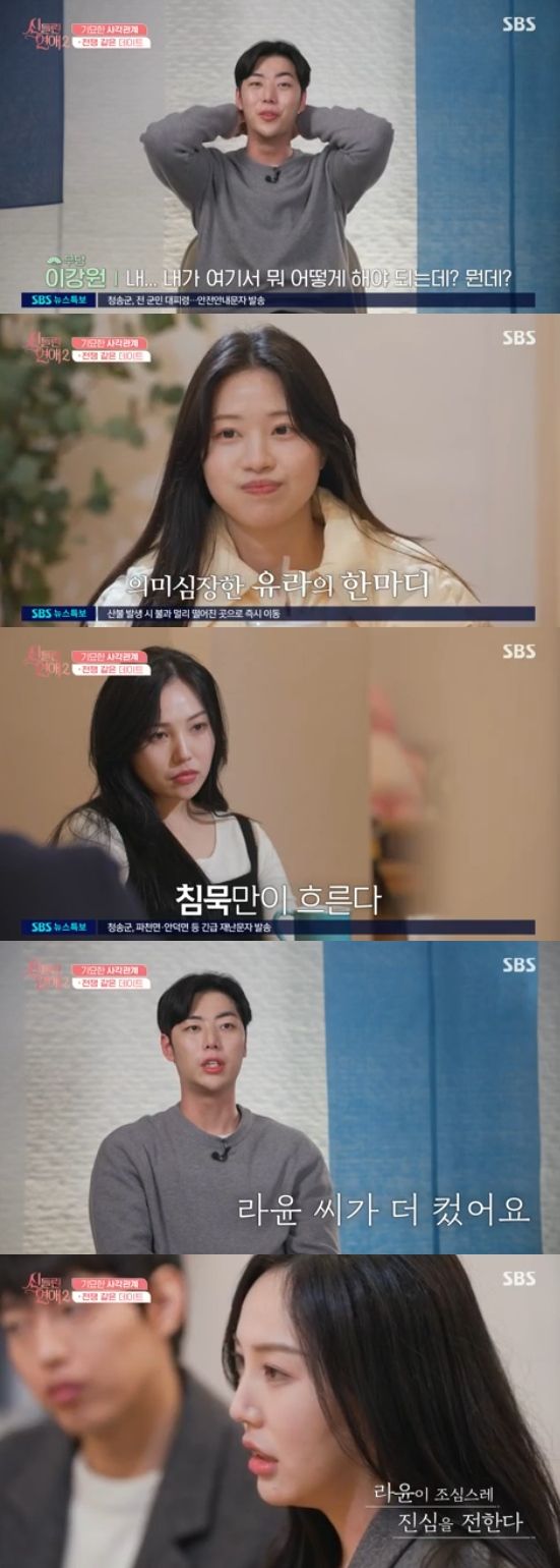 침묵을 깬 홍유라는 이라윤에게 "라윤 씨는 지금 어떤 마음인지 궁금하다"고 돌직구 질문을 던졌고, 이라윤은 "솔직히 말하면 관심이 있었던 것도 맞고, 직설적으로 했던 것도 맞다"면서 이강원을 언급했다.