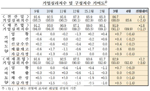 한국은행이 26일 발표한 ‘3월 기업경기조사 결과 및 경제심리지수(ESI)’에 따르면 이달 전산업 기업심리지수(CBSI)는 86.7으로 전월보다 1.4포인트 올랐다. 5개월만에 상승 전환이다.