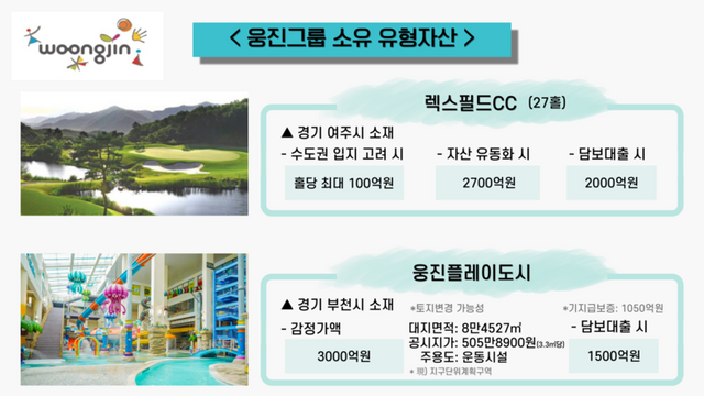 IB업계 한 관계자는 "웅진그룹이 렉스필드CC 지분을 66.67%, 웅진플레이도시를 80.26% 보유하고 있다"고 말했다. 이어 "두 유형자산을 매각하면 4000억원 가량을 조달할 수 있지만 현 부동산 시장을 볼 때 쉽지 않다"며 "렉스필드CC를 담보로 금융권에서 2000억원 가량을 조달할 수 있기에 유형자산 담보대출을 검토하고 있는 것으로 알고 있다"고 말했다. 이어 "웅진플레이도시 역시 1050억원의 지급보증이 들어가 있는 상태긴 하지만 담보대출로 1500억원 가량을 조달할 수 있을 것으로 보인다"고 부연했다.