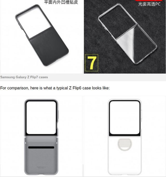GSM 아레나는 아이스 유니버스가 새로 유출한 케이스 이미지와 기존 Z 플립6 케이스 이미지를 함께 비교해서 게재했다. 삼성전자는 그동안 카메라와 플래시 주위의 상단 베젤을 케이스가 덮은 적이 없었다. 이전의 케이스들은 디스플레이 주변에 여전히 약간의 베젤이 있었다. 하지만 새로운 Z 플립7 케이스에서는 이 베젤이 눈에 띄게 얇아졌다.