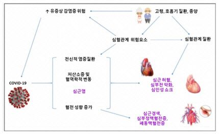 코로나19 바이러스는 폐에 있는 수용체를 통해 몸 속으로 들어오고, 강한 염증 반응을 일으켜 주로 호흡기 질환으로 진행된다. 하지만 폐뿐 아니라 몸속 여러 장기에 합병증을 일으킬 수 있고, 이로 인해 치명적인 상태로 악화될 수 있다. 코로나19는 전신 염증을 심하게 만들어, ‘사이토카인 폭풍(cytokine storm)’이라 불리는 상태를 유발할 수 있으며, 동시에 혈전을 잘 만들게 하는 성향도 높아져 심근경색, 뇌졸중, 정맥혈전증 등의 위험도 크게 증가한다(그림 참조). 하지만 한국인은 선천적으로 혈전이 잘 생기지 않는 체질이기 때문에, 코로나19 감염으로 인한 혈전 발생도 적은 편이다. 실제로 한국인에게서 코로나19 이후 혈전 질환이 드물게 발생했다는 것은 여러 연구에서 확인되고 있으며, 죽상경화증이나 암에 동반된 혈전증도 다른 인종보다 적다는 보고가 계속 나오고 있다.