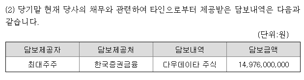 김 회장 본인이 보유한 다우데이타 지분을 담보로 대출 보증도 서줬다. 2010년말 기준 담보금액은 150억원이다. 당시 이머니는 다우데이타 초기 지분 10%를 확보하는 데에 105억원을 사용한 상황이었다. 이머니의 당시 당기순익이 11억원임을 감안하면 김 회장의 자금 지원은 큰 보탬이 됐을 것으로 보인다.