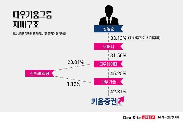 키움증권의 최대주주는 다우기술(42.31%)이다. 다우기술은 다시 다우데이타(45.2%)에, 다우데이타는 비상장법인인 이머니(31.56%)의 지배를 받고 있다. 김 대표는 이머니의 최대주주로 지분 33.13%를 보유중이다. 특히 이머니는 자사주 54.82%를 보유하고 있어, 김 대표의 실질 지배력은 보유지분보다 훨씬 더 높다.