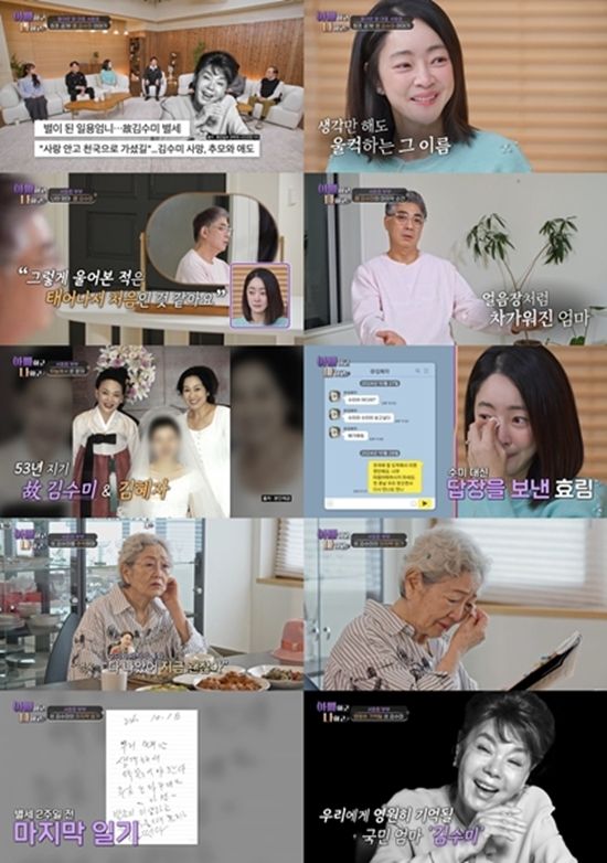 이날 방송에서는 故김수미의 일기장 원본이 방송 최초로 공개됐다. 16살 서울에 처음 올라왔을 때부터 지난 해 세상을 떠나기 전까지 60여 년간 꾸준히 작성한 고인의 일기장에는 아들 정명호를 향한 끝없는 사랑, 절친 김영옥과의 추억, 건강하자는 다짐들이 가득했다.