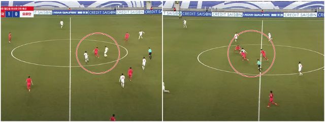 알마르디의 슈팅 순간에는 페널티박스에 요르단 선수 3명, 한국 선수 8명이 있었다. 이번에도 슈팅을 효과적으로 막지 못했고 실점으로 연결됐다. 알마르디가 슈팅으로 가져가는 순간에도 수적 우위의 비효율성은 그대로 보였다. 후방에서 쇄도하는 세 명의 요르단 선수에 대한 마크는 전혀 없었다.
