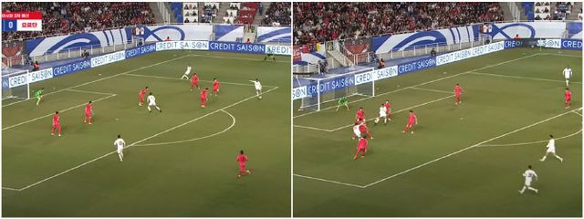 요르단의 역습 시작 위치는 중앙선 부근. 우리 골대와는 거리가 있었다. 무엇보다 빠르게 세 명의 선수가 에워싸며 역습을 지연할 수 있는 상황을 만들었다. 그러나 알나이마트의 두 차례 터치에 세 선수가 모두 벗겨졌다.