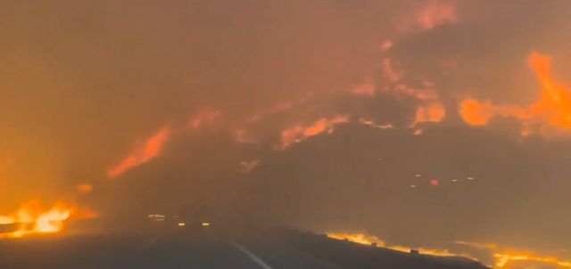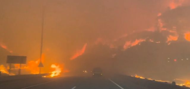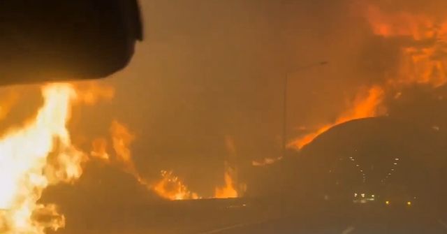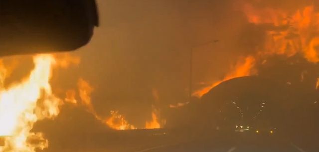 고속도로는 중앙선 분리대까지 불길에 휩싸였다. 산불로 발생한 연기 때문에 도로 앞이 한치도 보이지 않는다. 비상등 덕분에 앞선 차량이 있다는 게 인식되는 상황이다. 화면으로만 봐도 열기가 느껴질 정도다.