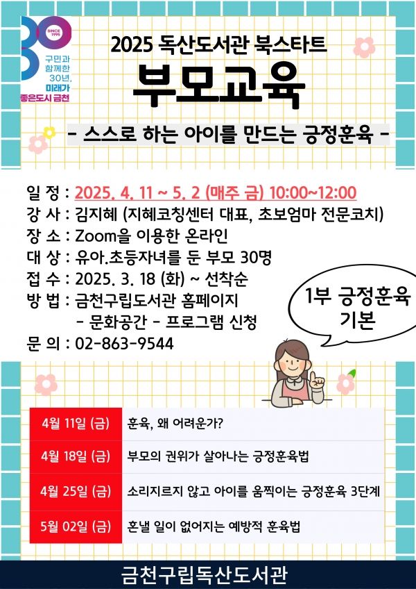 금천구립독산도서관은 오는 4월 11일부터 영유아와 초등 자녀를 둔 부모를 위한 ‘2025년 금천구 북스타트 사업’을 운영한다.