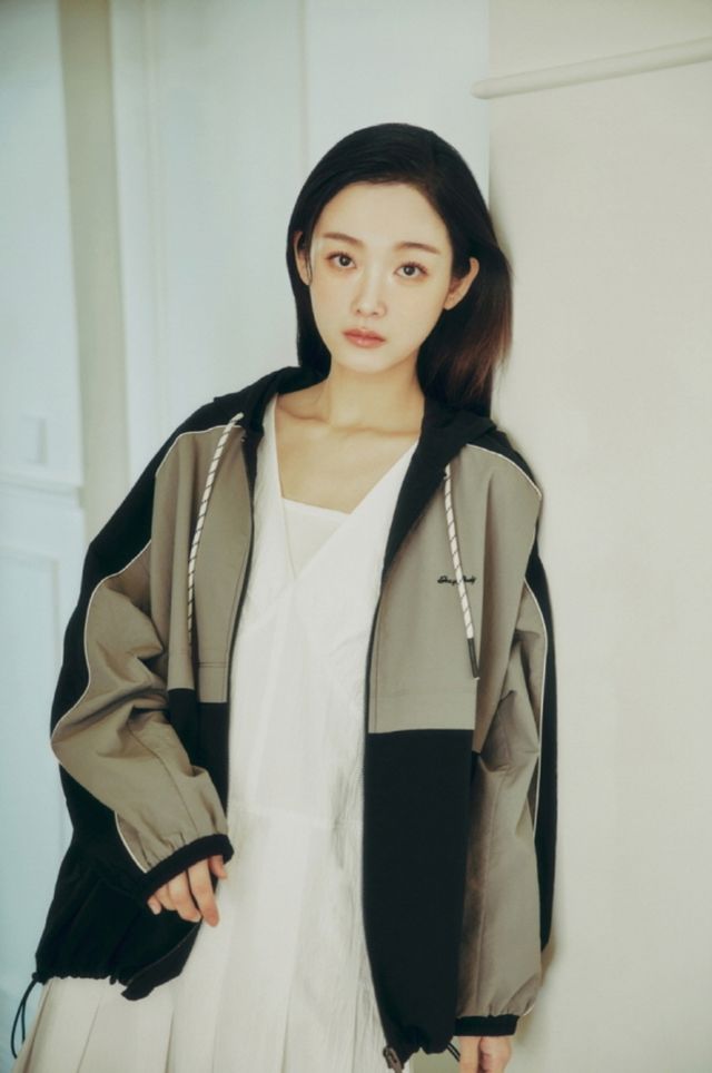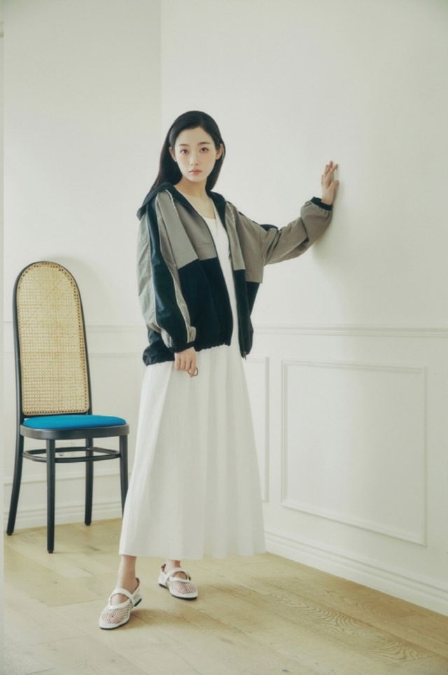 쥬시쥬디 모델 이유미는 특유의 표현력으로 브랜드 아이덴티티에 꼭 맞춘 다양한 스타일링을 완벽히 소화했다. 첫 번째 화보에서는 집업점퍼와 플리츠 롱 원피스를 믹스매치했다. 컬러블록으로 배색 포인트를 준 후드형 점퍼를 드레시한 원피스의 위에 레이어드해 여성스러우면서도 캐주얼한 상반된 매력을 표현했다. 사이드 포켓에 손을 넣고 벽에 가볍게 기댄 이유미의 모습은 도시적인 무드를 완성한다.