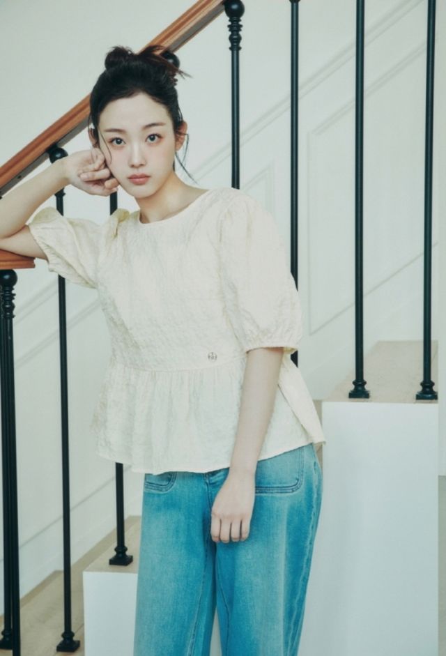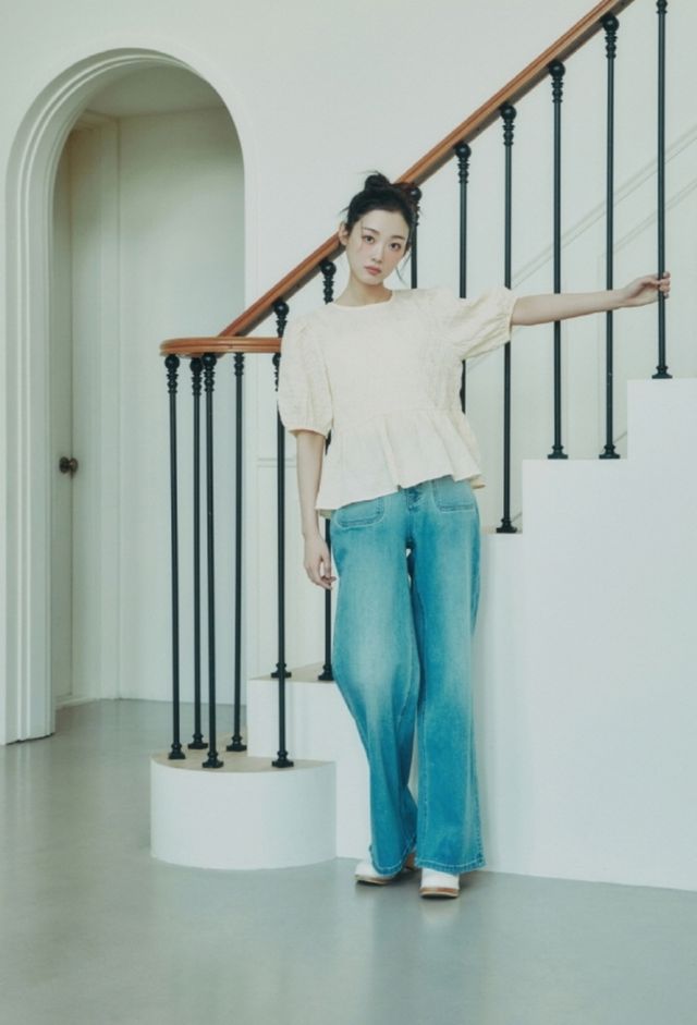 여름에 어울리는 퍼프소매 블라우스와 데님팬츠 조합도 눈길을 끈다. 허리선이 살짝 높은 베이비돌 핏앤플레어 라인의 블라우스는 이유미의 귀엽고 페미닌한 분위기를 한층 부각시켜준다. 함께 착용한 하이웨이스트 부츠컷 데님은 시원한 인디고 컬러에 핏 되지 않으면서도 슬림한 실루엣으로 바디라인을 강조한다.