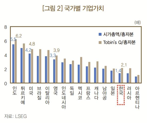 한국은 매출 성장률과 부채비율 측면에서 선진국 대비 양호한 성과를 보였으나, 시가총액 대비 자본비율(PBR)과 토빈의 Q 등 핵심 지표에서는 최하위 수준을 기록했다. 한국의 PBR은 1.4에 불과해 미국(4.2), 인도(5.5) 등에 비해 현저히 낮았다.