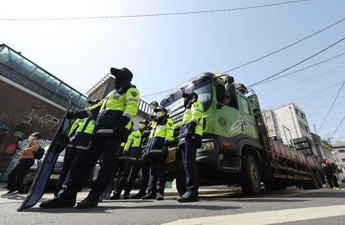 26일 전국농민회총연맹, 윤석열 즉각 퇴진·사회대개혁 비상행동 등 윤석열 대통령 탄핵 찬성 단체들이 집회를 이어가고 있는 서울 자하문로로 트럭이 진입하려고 하자 경찰이 이를 막고 있다. 2025.3.26