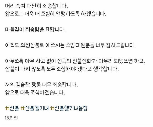 그는 사과문 말미에 #산불 #산불헬기녀 #산불헬기녀등장이라고 해시태그를 걸었다.