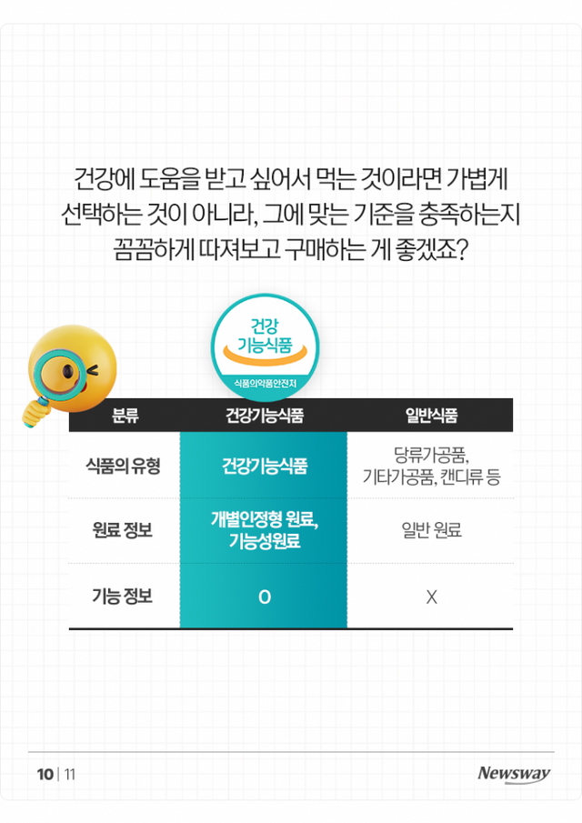 건강에 도움을 받고 싶어서 먹는 것이라면 가볍게 선택하는 것이 아니라, 그에 맞는 기준을 충족하는지 꼼꼼하게 따져보고 구매하는 게 좋겠죠?(카드뉴스 표 참조)