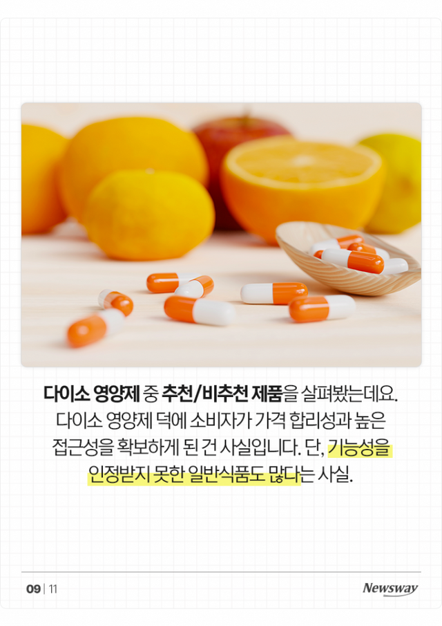 다이소 영양제 중 추천/비추천 제품을 살펴봤는데요. 다이소 영양제 덕에 소비자가 가격 합리성과 높은 접근성을 확보하게 된 건 사실입니다. 단, 기능성을 인정받지 못한 일반식품도 많다는 사실.