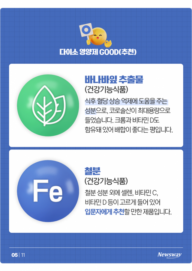 ▲바나바잎 추출물(건강기능식품) = 식후 혈당 상승 억제에 도움을 주는 성분(여기 이런 색 비슷하게 실제 음영)으로, 코로솔산이 최대용량으로 들었습니다. 크롬과 비타민 D도 함유돼 있어 배합이 좋다는 평입니다.