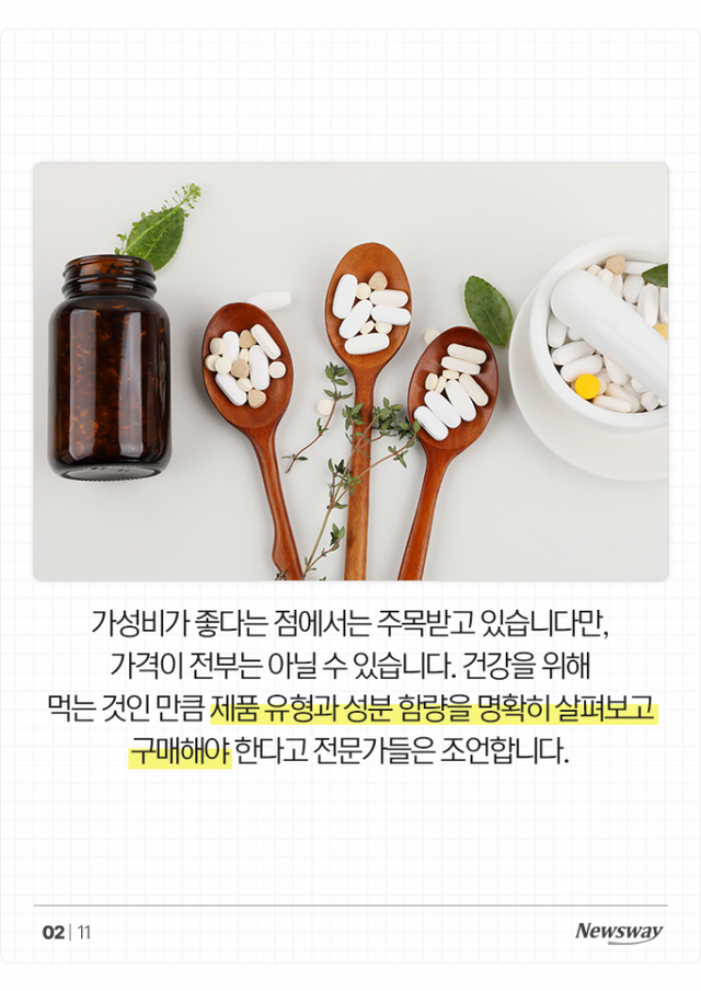 가성비가 좋다는 점에서는 주목받고 있습니다만, 가격이 전부는 아닐 수 있습니다. 건강을 위해 먹는 것인 만큼 제품 유형과 성분 함량을 명확히 살펴보고 구매해야 한다고 전문가들은 조언합니다.