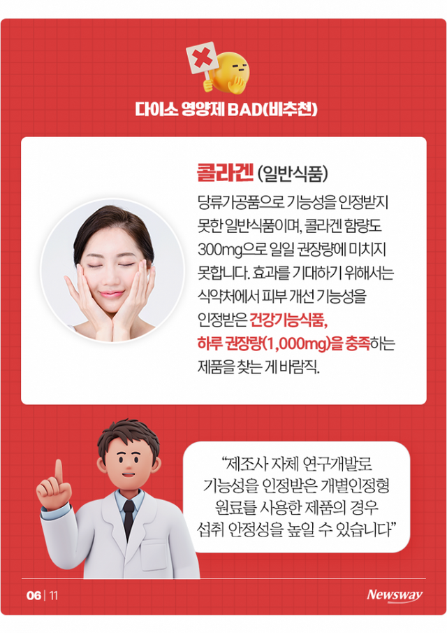 ▲콜라겐(일반식품) = 당류가공품으로 기능성을 인정받지 못한 일반식품이며, 콜라겐 함량도 300mg으로 일일 권장량에 미치지 못합니다. 효과를 기대하기 위해서는 식약처에서 피부 개선 기능성을 인정받은 건강기능식품, 하루 권장량(1,000mg)을 충족하는 제품을 찾는 게 바람직.