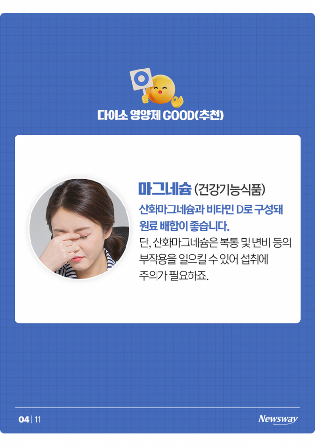▲마그네슘 (건강기능식품) = 산화마그네슘과 비타민 D로 구성돼 원료 배합이 좋습니다. 단, 산화마그네슘은 복통 및 변비 등의 부작용을 일으킬 수 있어 섭취에 주의가 필요하죠.