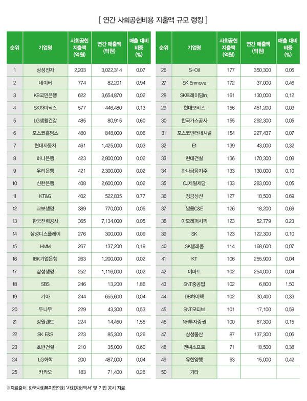 연간 사회공헌 지출액 1위는 삼성전자...2,203억원 지출, 압도적 1위