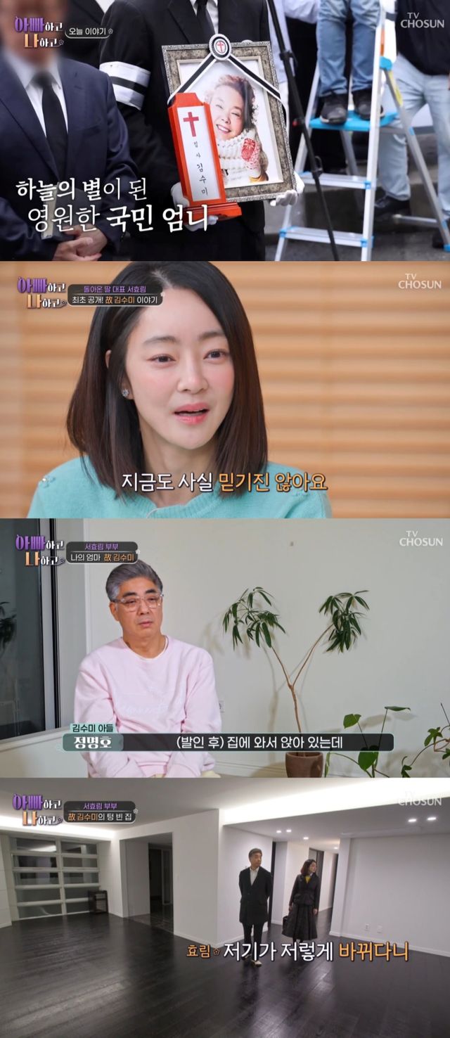 이어 서효림과 정명호는 유품 정리에 앞서 김수미의 텅 빈 집을 방문했다. 두 사람은 트로피와 사진, 가구 등 김수미로 가득했던 과거의 집을 그리워했다.