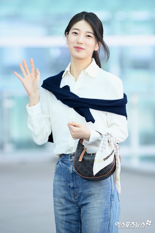 이날 수지는 아이보리 색 셔츠와 데님 팬츠, 스틸레토 힐로 깔끔한 패션으로 공항에 등장했다.