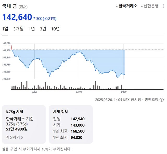 국내 금시세(금값)가 26일(한국 시각) 오후 하락세(전 거래일 대비)를 보이고 있다.
