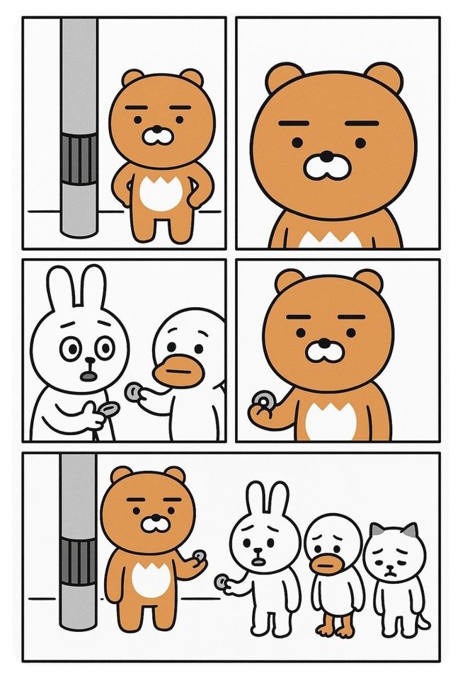 "(라이언 이미지를 업로드하고) 이런 캐릭터가 전봇대 옆에서 다른 동물 친구들 삥뜯는 모습 4컷만화로 그려줘"