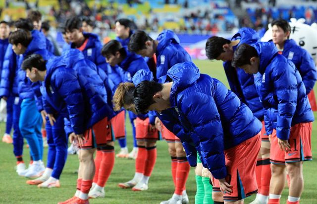 지난 25일 오후 경기도 수원시 팔달구 수원월드컵경기장에서 열린 2026 국제축구연맹(FIFA) 북중미 월드컵 아시아 3차 예선 B조 8차전 대한민국과 요르단의 경기를 무승부로 마친 손흥민을 비롯한 축구대표팀 선수들이 피치를 돌며 팬들에게 인사하고 있다. / 뉴스1