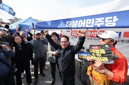 26일 서울 광화문 더불어민주당 천막 당사에서 더불어민주당 박선원 의원이 이재명 대표 공직선거법 위반 혐의 항소심 무죄 소식을 들은 뒤 만세를 외치고 있다. 2025.3.26