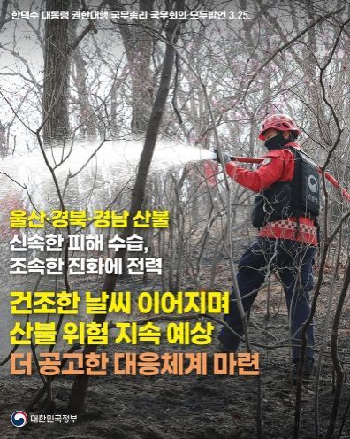 정부는 경남 산청을 비롯한 4개 지역을 특별재난지역으로 선포하고 신속하게 피해를 수습하는 한편, 조속히 산불을 진화하는 데 전력을 다하겠습니다.