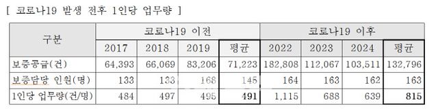 이 기간 중 경기신보의 보증담당 인원은 2019년 168명에서 2024년 162명으로 외려 6명 줄었다. 1인당 업무량은 코로나19 이전 3년간 연평균 491건에서 이후에는 815건으로 폭증했다.