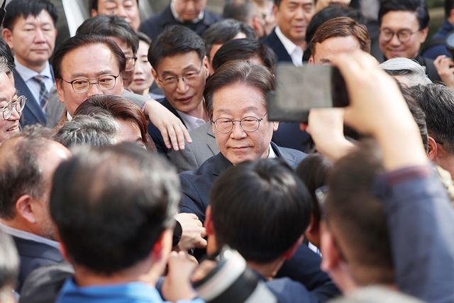 이재명 더불어민주당 대표가 26일 공직선거법 위반 사건 항소심에서 무죄를 선고받은 뒤 현장에 나온 의원들과 인사를 나누고 있다. / 연합뉴스