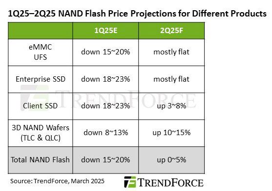 트렌드포스는 “잠재적인 미국 관세 인상에 대비해 가전 업체가 생산을 늘리며 수요가 증가했고 PC, 스마트폰, 데이터센터 부문 전반에 걸쳐 재고 확보가 진행 중”이라며 “ 2분기부터 낸드 가격이 안정화될 것”이라고 설명했다.