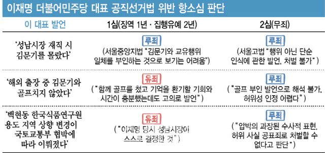 1심은 고(故) 김문기 전 성남도시개발공사 개발1처장 관련 이 대표 발언 가운데 ‘해외출장 중 김문기와 골프를 치지 않았다’는 부분과 백현동 부지 관련 ‘국토부 협박을 받아 용도지역을 변경했다’는 발언에 대해서는 유죄로 판단했다.