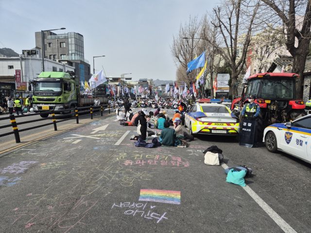 지난 겨울 경찰이 윤석열 대통령 파면을 촉구하는 전국농민총연맹의 트랙터 행진을 막아 일어났던 '남태령 대첩'이 약 3개월 만에 서울 시내 한복판에서 재현됐다. 경찰이 서울 종로구 경복궁 인근에 주차된 전농의 트랙터 한 대를 견인하려 하자 이에 항의하는 시민들이 연좌 농성을 벌이면서다.