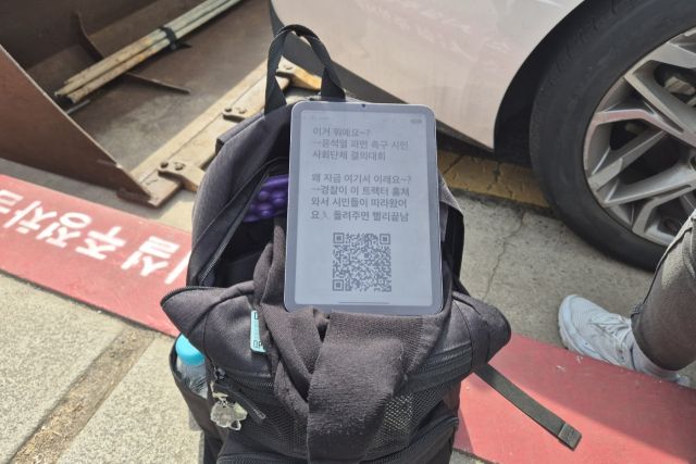 30대 시민 임모 씨는 "농민들이 트랙터를 끌고 여기까지 올라오신 것만 해도 마음이 아픈데, 그냥 다녀가게만 해줘도 될 걸, 경찰이 보여주기식으로 막아선 것 같아 속상하다"고 했다. 다른 시민은 "경찰이 이 트랙터 훔쳐와서 시민들이 따라왔어요. 돌려주면 빨리 끝남"이라는 문구를 띄운 아이패드를 가방 위에 올려둔 채 트랙터 옆에 앉아 있었다.