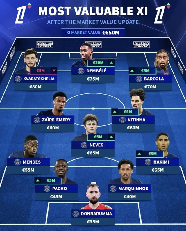 새로 매겨진 몸값으로 뽑은 베스트11에 모두 PSG 선수들이 들어갔다. 리그1을 통틀어 포지션마다 몸값이 제일 비싼 선수가 PSG 소속인 것이다.