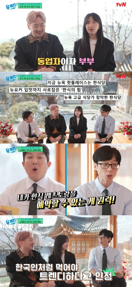 유재석은 "두 분이 동업자이자 부부이시기도 하고 두 분을 모신 이유가 요즘 뉴욕에서 한식의 인기가 어마어마하다는 뉴스를 보신 적이 있을 것 같은데 '미국에서 한식은 되게 힙하고 한식을 모르면 촌스러운 느낌이다' 정말 추세가 그렇냐"라며 궁금해했다.