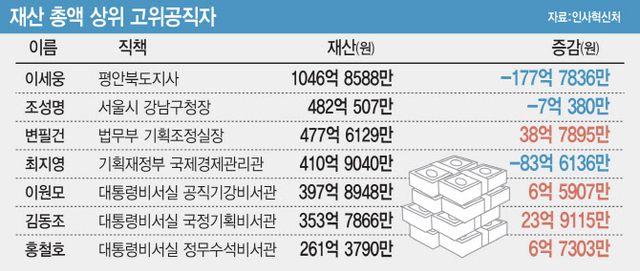 이세웅 평안북도지사는 1046억 8588만원을 신고하며 전체 고위공직자 가운데 재산이 가장 많았다. 앞선 신고 때보다 177억 7836만원 줄었다. 보유 주식이 695억 4940만원에서 521억 974만원으로 평가액이 감소하면서다. 조성명 서울시 강남구청장이 482억 507만원을 신고하며 두 번째로 재산이 많았고, 이어 변필건 법무부 기획조정실장(477억 6129만원), 최지영 기획재정부 국제경제관리관(410억 9040만원) 순이었다.
