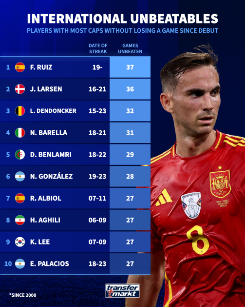 1위는 이강인의 동료이기도 한 파비안 루이스(스페인)다. 2019년부터 스페인 국가대표로 활동하고 있는 루이스는 출전한 경기에서 37경기 연속 무패 기록을 세웠다. 루이스는 이 명단에서 국가대표팀 경기 무패 기록을 이어가고 있는 유일한 선수다.
