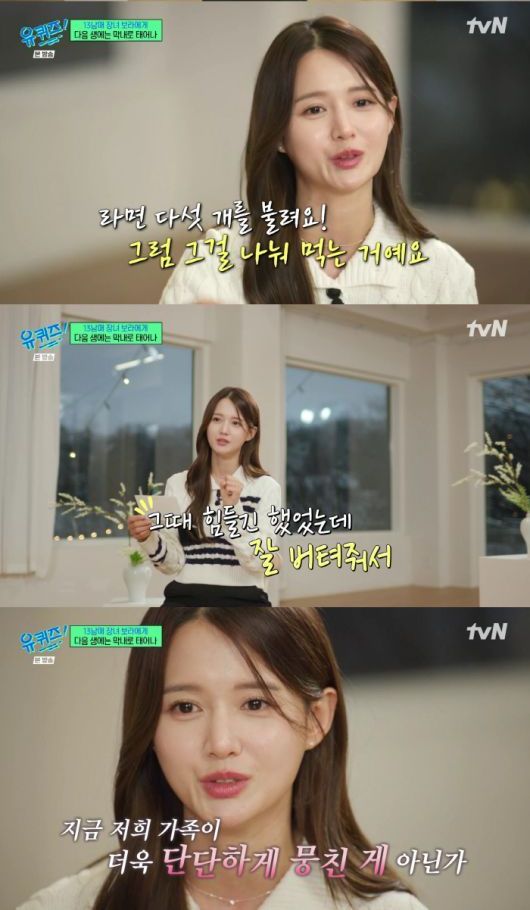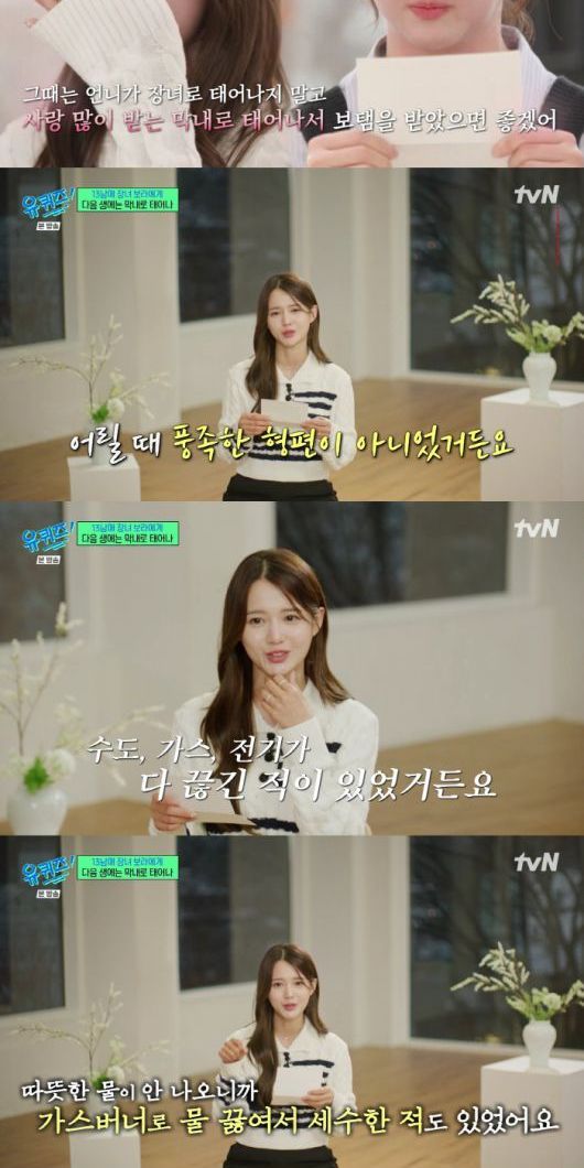 이에 남보라는 눈물을 흘리며 "저희가 어릴 때 풍족한 형편이 아니었다. 수도 가스 전기가 다 끊긴 적도 있었다. 촛불을 켜고 가스버너로 물 끓여서 세수하고 학교 간 적이 있다. 라면 다섯 개를 불린 다음 같이 나눠먹기도 했다. 근데 아무도 불평한 사람이 아무도 없었다. 힘들긴 했는데 잘 버텨줘서 지금 저희 가족이 단단하게 뭉친 것 같다"고 말했다.