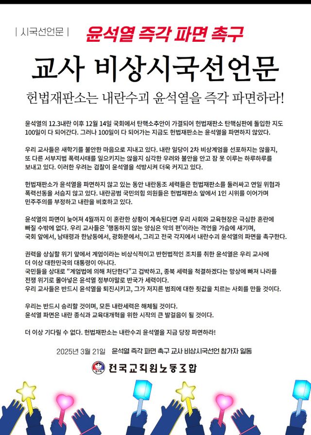 이어 “윤석열의 파면이 늦어져 4월까지 이 혼란한 상황이 계속된다면 우리 사회와 교육현장은 극심한 혼란에 빠질 수밖에 없다”고 우려했다. 아울러 “우리 교사들은 ‘행동하지 않는 양심은 악의 편’이라는 격언을 가슴에 새기며 국회 앞, 남태령, 한남동에, 광화문 등 전국 각지에서 내란주범 윤석열의 파면을 촉구한다”고 강조했다.
